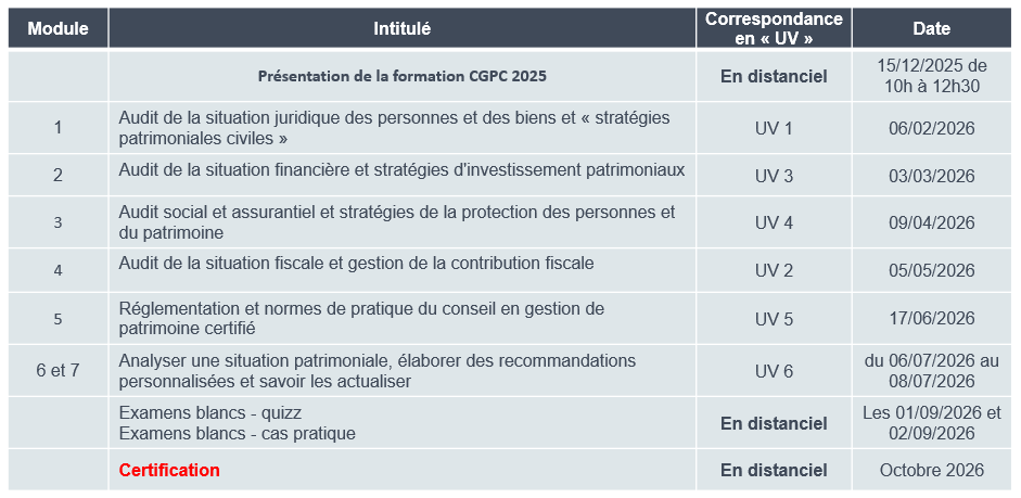 Planning de la formation préparatoire à la certification ECGP-CFP